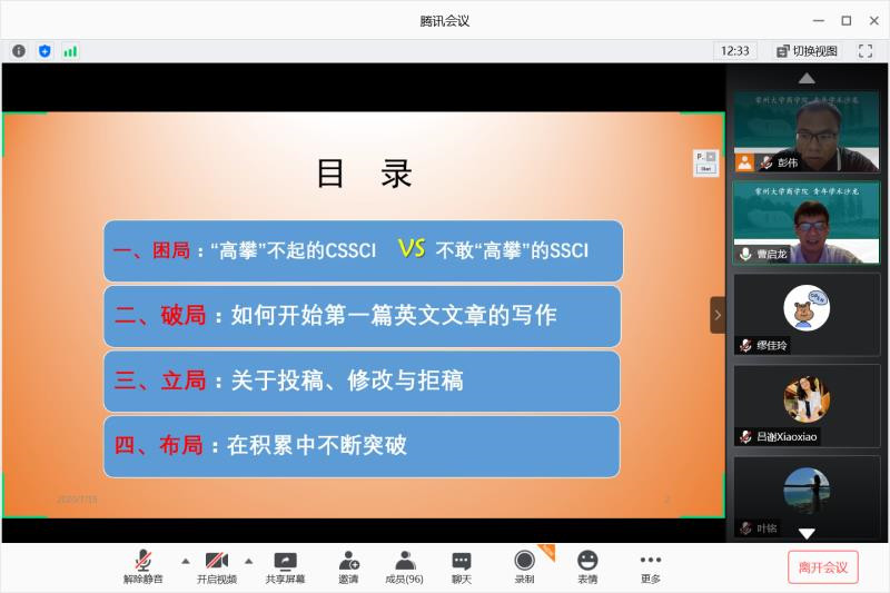 为营造良好的学术文化氛围,提高师生科研学术能力,威廉希尔官网于7月15日晚上在“云端”举行第3期青年学术沙龙。本次沙龙由威廉希尔官网曹启龙博士主讲,校内多个学院的120多名教师、研究生参加沙龙。沙龙由威廉希尔官网副经理彭伟主持。 曹启龙博士结合自己在国际知名期刊发表SSCI/SCI论文的经历,从“困局、破局、立局、布局”等四个方面出发,全面细致地分享了发表高水平学术论文背后的故事与技巧。随后,在线上答疑环节中,师生们积极参与在线互动交流,根据沙龙内容并结合科研工作中遇到的问题踊跃提问,曹启龙博士一一给予解答,整个线上学术讨论氛围融洽。 历时一个半小时的线上会议干货满满、气氛热烈,参会师生均表示受益匪浅。曹启龙博士关于在推敲中撰写论文、在积累中不断突破的观点,启示着师生在科研工作中应当保持信心、细心与恒心。本次线上学术沙龙的举行使师生们对高水平学术论文写作有了更深入的理解,为师生们今后撰写并发表高水平学术论文增添了信心与动力。 曹启龙学术简介:南京大学管理学博士,现就职于威廉希尔官网,主要研究领域为社会创新治理,先后主持承担国家博士后科学基金面上项目1项、江苏省社科青年项目1项、江苏省博士后基金项目1项,在《International Journal of Environmental Research and Public Health》《Journal of Health Psychology》《Current Psychology》等国际知名期刊发表SSCI/SCI检索论文20余篇,在《中国软科学》《系统工程学报》《运筹与管理》等国内知名期刊发表论文10余篇。