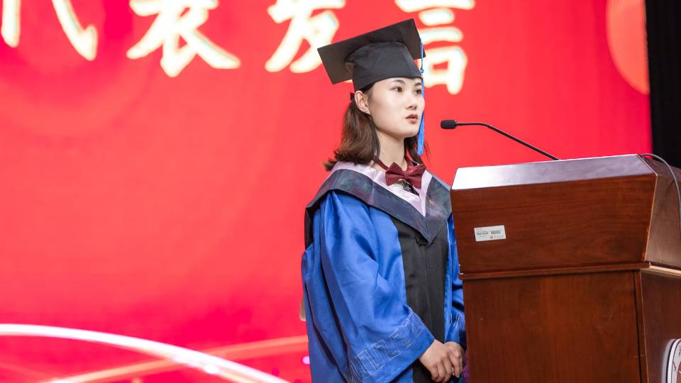 毕业仪式在庄严的国歌声中正式拉开帷幕,进入整个典礼的《追梦青春·典赞前行》篇章。学院导师们为优秀毕业研究生、优秀毕业本科生授予了学位。在激扬动情的器乐弹唱《灯火里的中国》后,优秀研究生毕业生蔡芙蓉和优秀本科毕业生徐昊飞代表本届毕业生进行了发言,表达了感激,畅想了未来,凝聚了责任。之后,学院领导为班级员工联络员颁发了聘书。