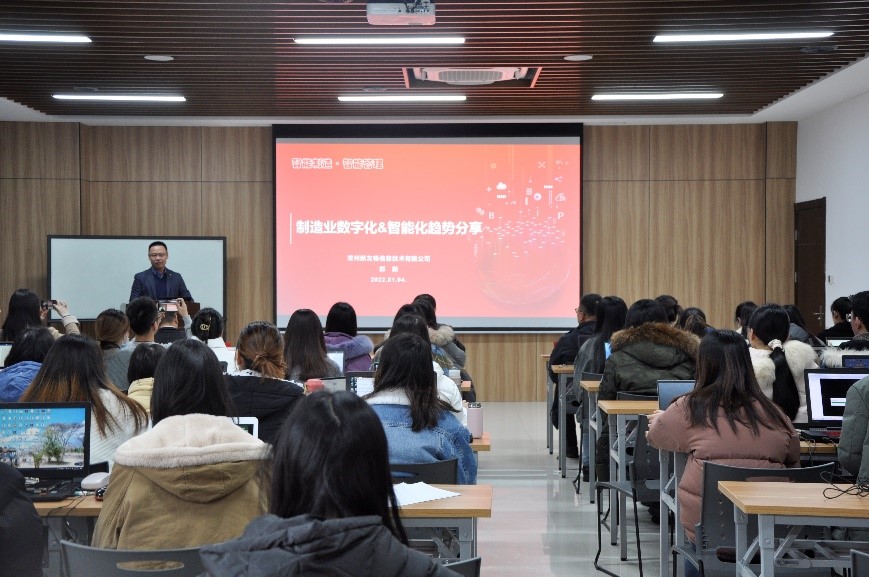 常州新友畅信息技术有限公司副总经理郑新发表致辞,向同学们介绍了常州新友畅关于我们,分享了制造业数智化发展趋势,并就校园到职场的角色转变提出了意见和建议。郑新表示希望同学们更换赛道、转变角色,迎未来、赢未来。把握机遇,必将大有可为!